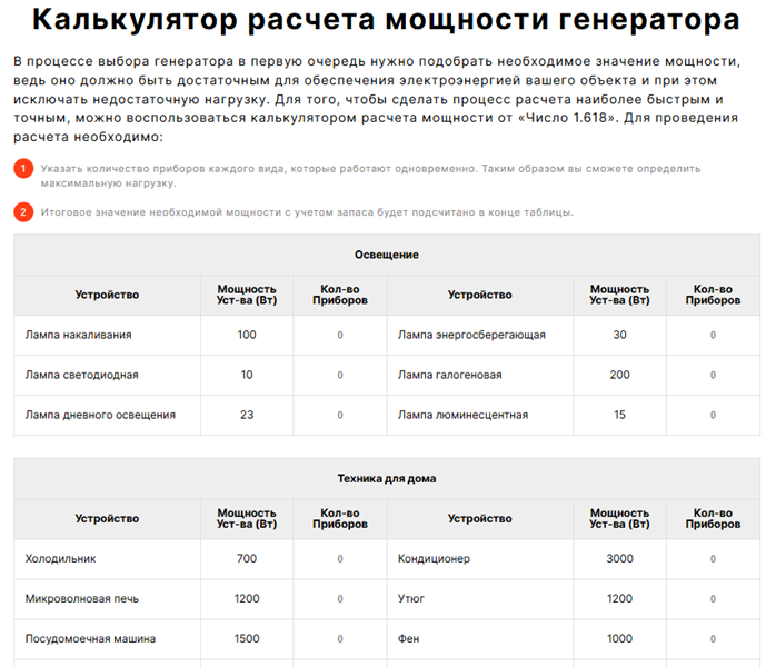 Чтобы выбрать подходящую мощность генератора, рекомендуем воспользоваться нашим калькулятором. Вы можете указать количество приборов, которые работают одновременно, таким образом вы узнаете максимальную нагрузку. Итоговое значение с учетом запаса будет указано в конце таблицы, а также рекомендуемые модели генераторов.